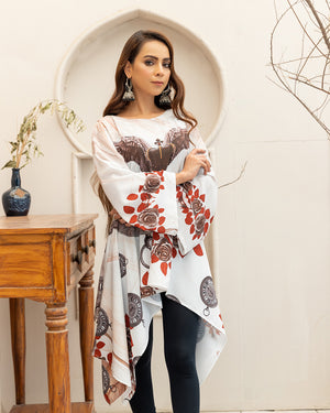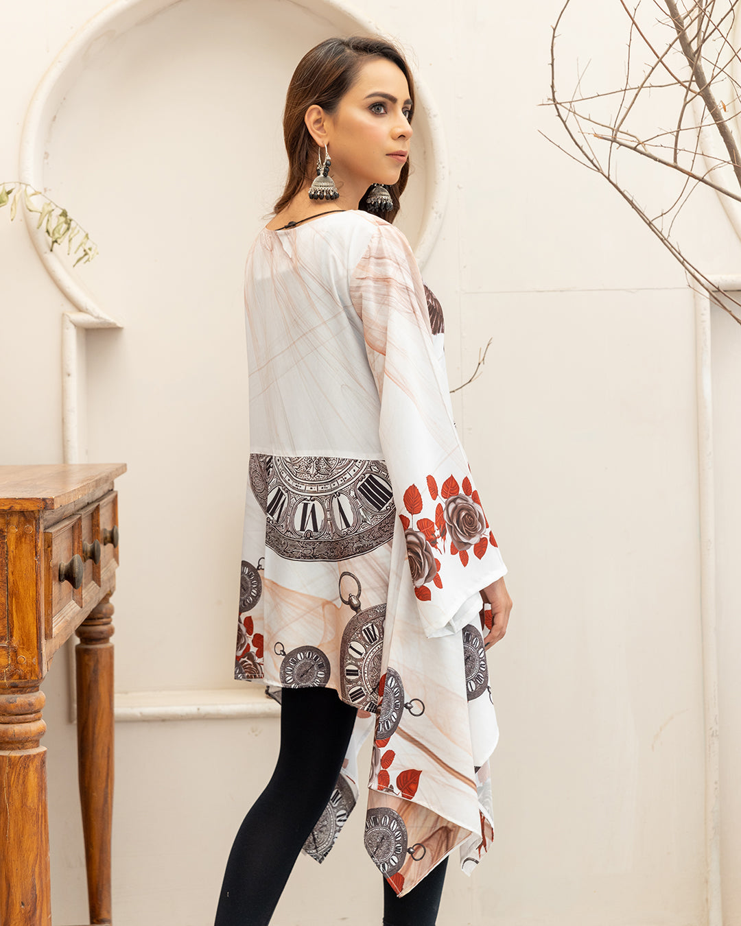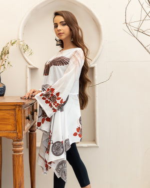 This beautiful printed outfit short frock & made in breeza lawn fabric Length 32.stitched styleish & westren cutline. Model is wearing size S.