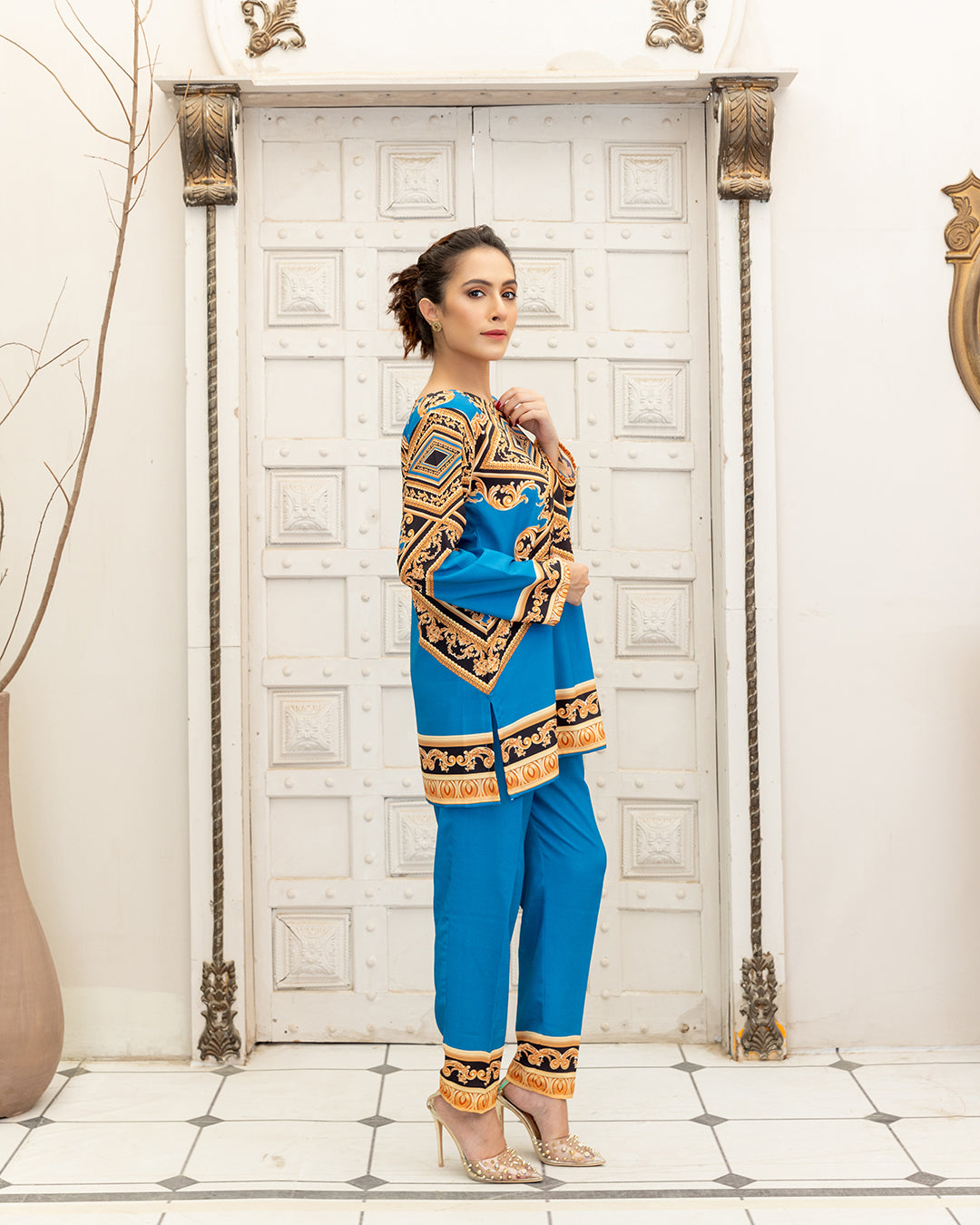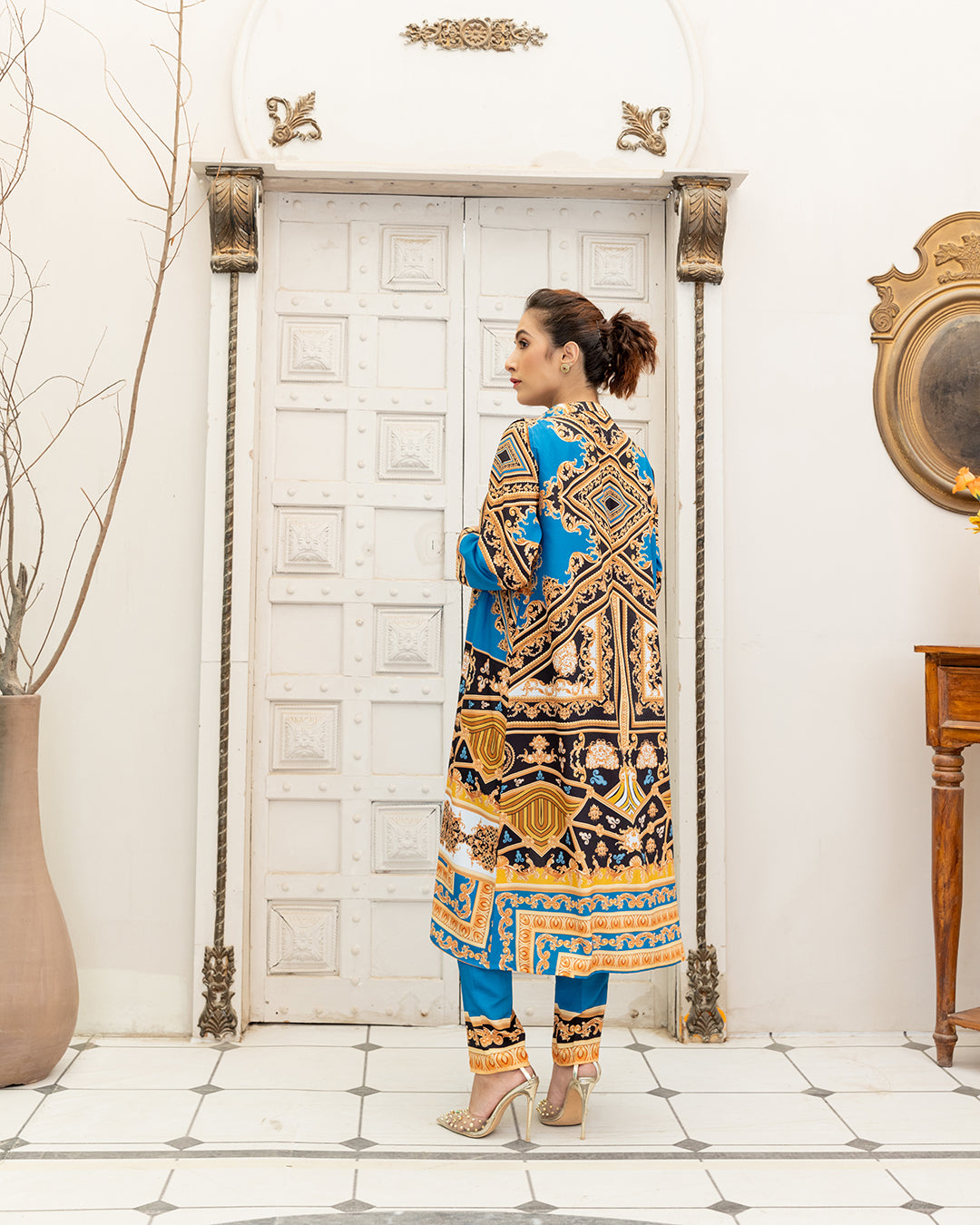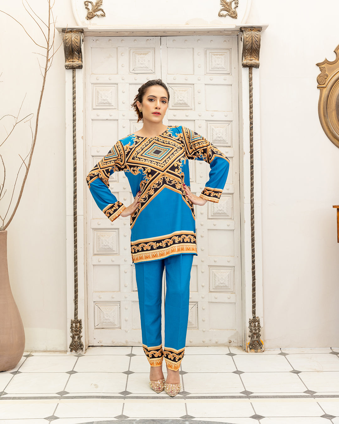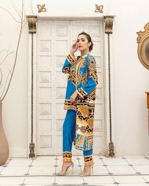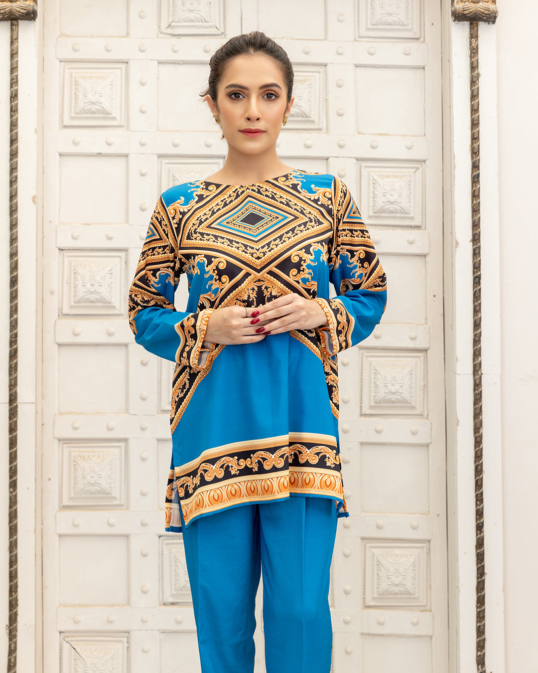 This beautiful printed 3PCS outfit made in soft GRIP SILK fabric. its inner shirt & goan & trouser . shirt Length 28 & goan lenght 48 . shirt is full sleeves and goan without sleeves .stitched styleish & westren cutline. Model is wearing size S.