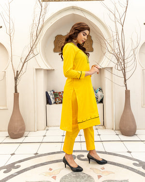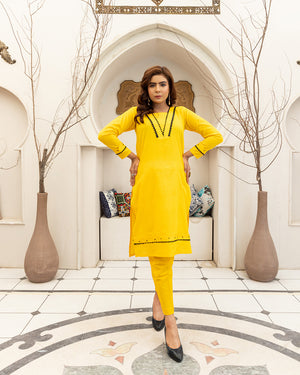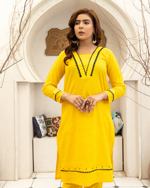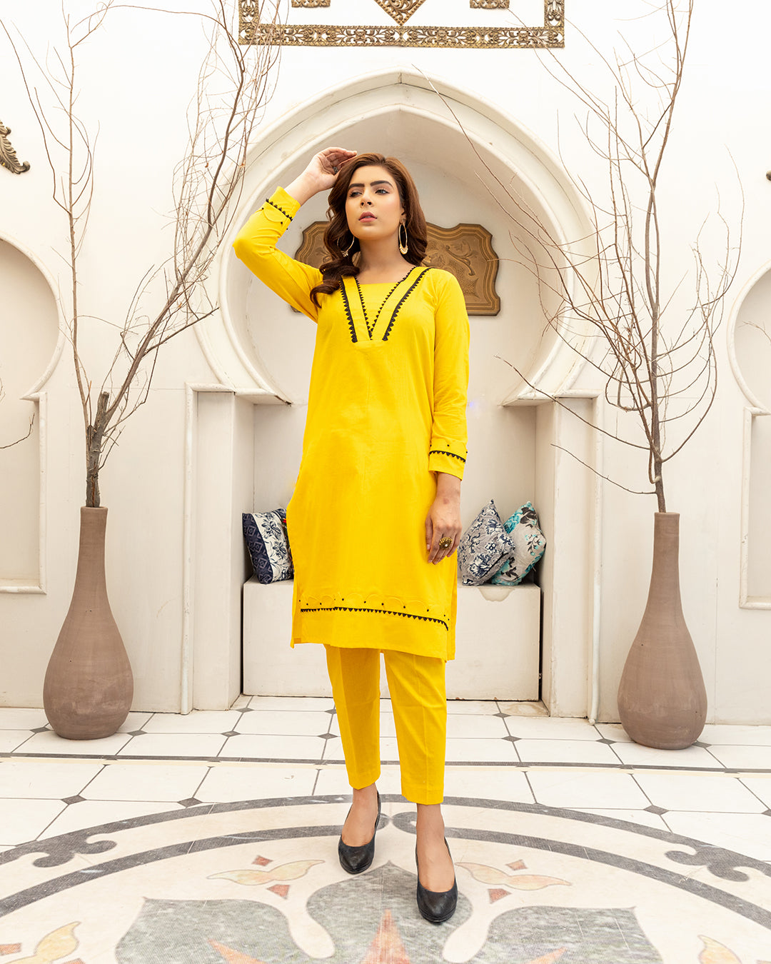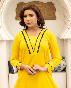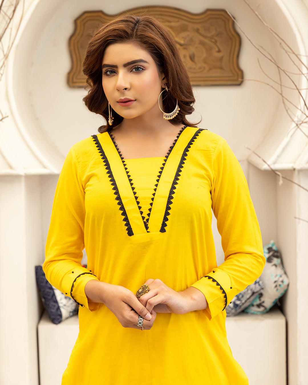 This YELLOW outfit shirt & trouser made in soft cotton fabric embellish with BLACK lace on neck, & arms stitched with stylish cutline . Length 40''. Model is wearing size S.
