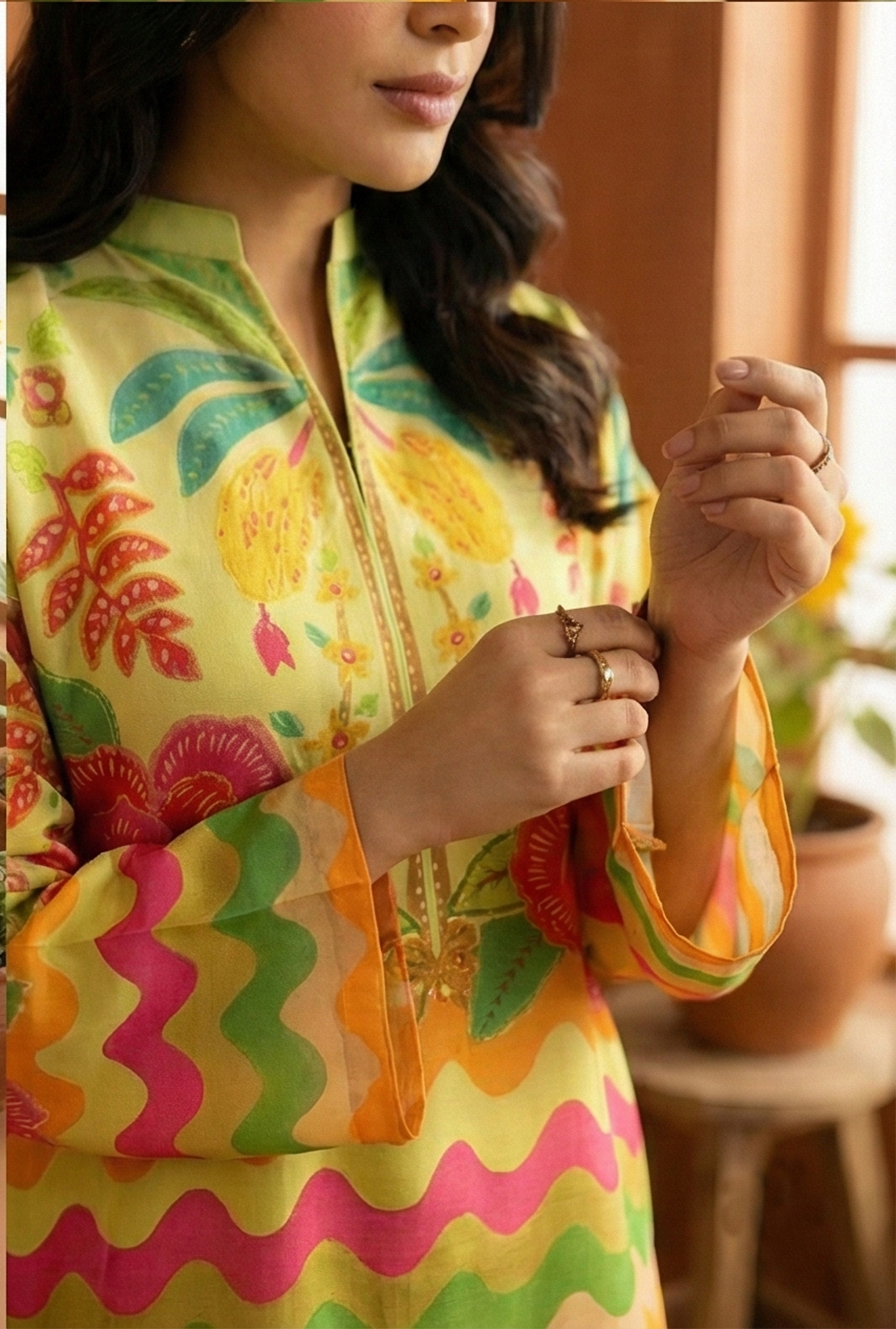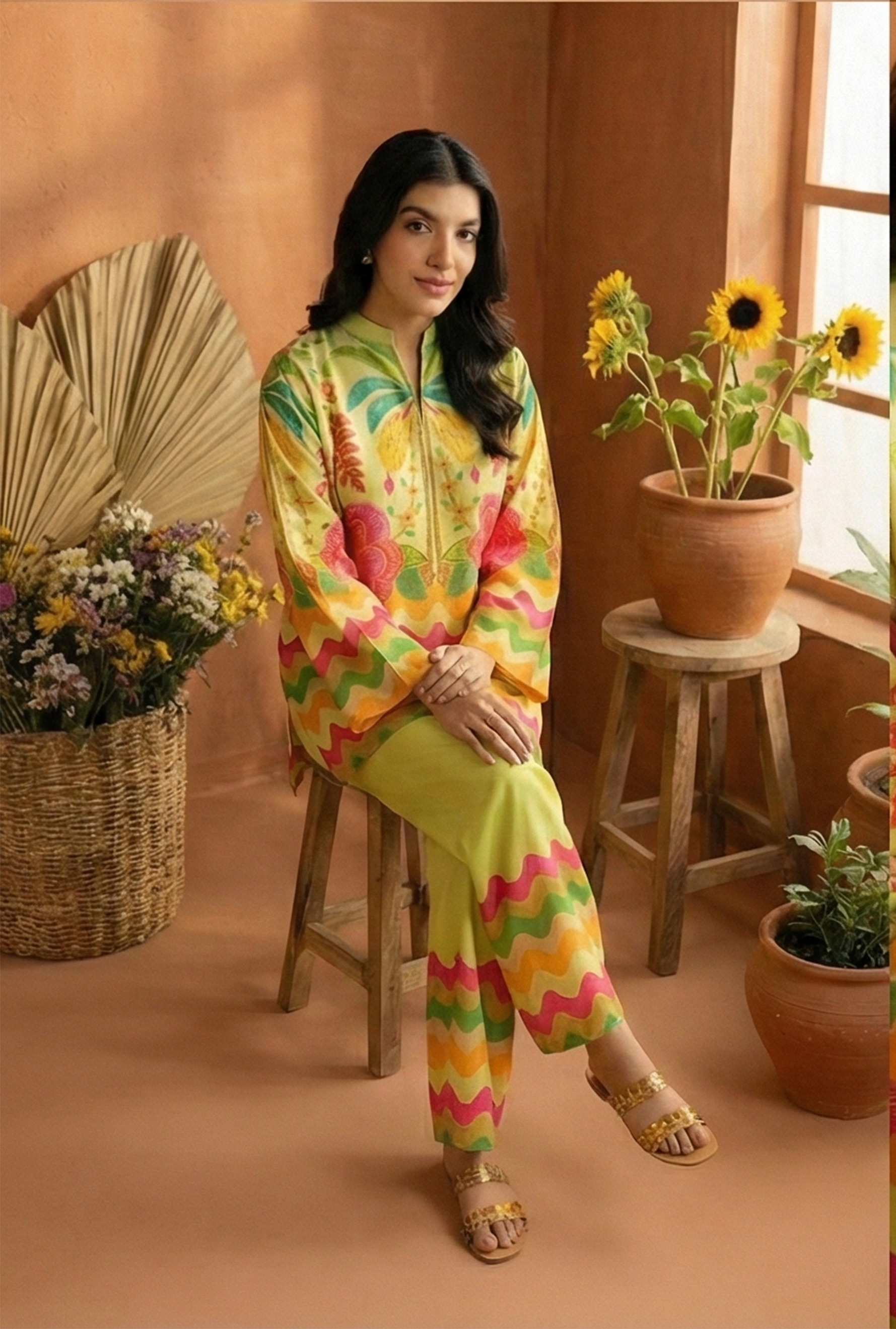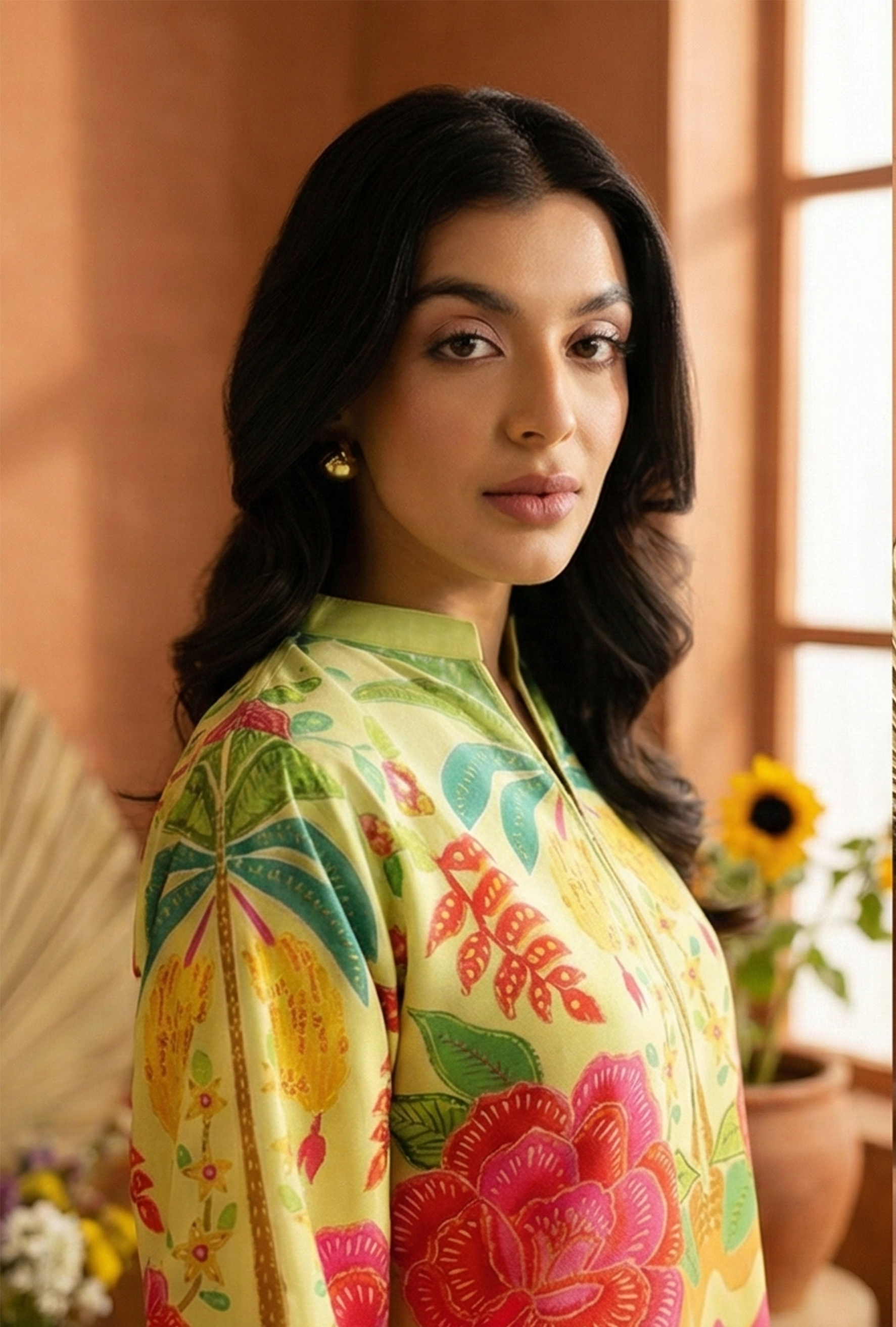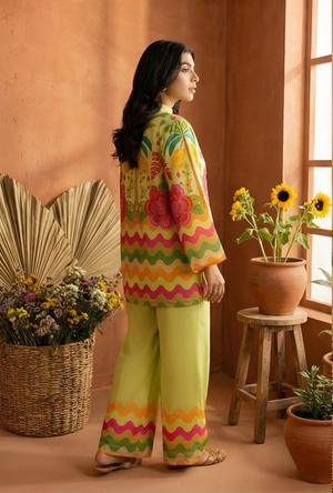 Refresh your summer wardrobe with the vibrant charm of this printed lawn two-piece suit, crafted for comfort with a statement look. The outfit features a lively lime-green base, beautifully enhanced with bold floral and botanical motifs in shades of pink, yellow, and leafy green, creating a cheerful and refreshing summer vibe.