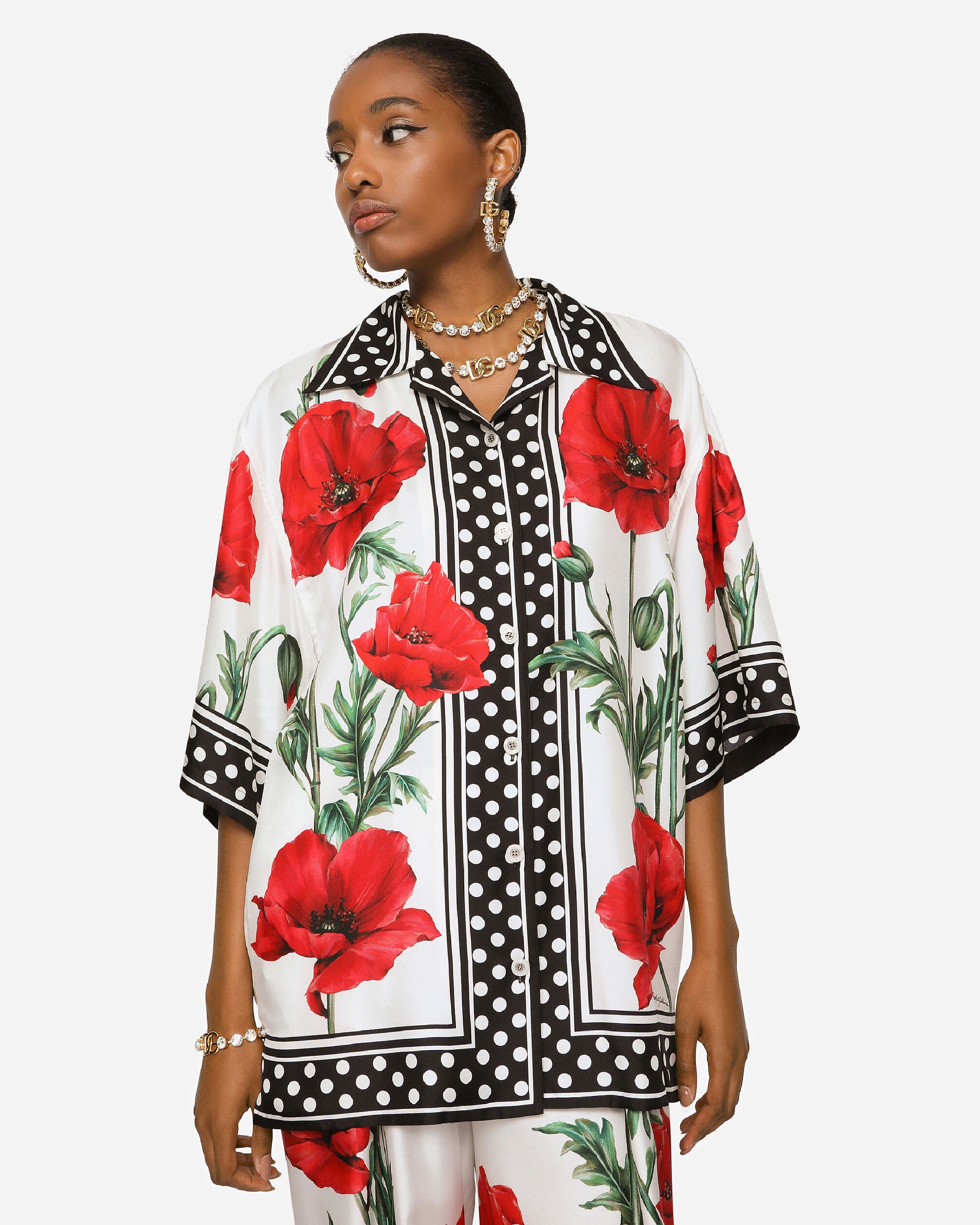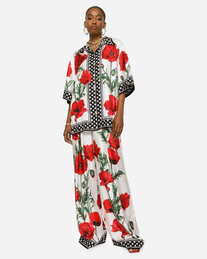 Silk shirt & Trouser with poppy print: • Shirt collar • Full sleeves • Oversized fit • Front open slit button • Shirt length is 30 inches • Model is wearing small size • Made in Pakistan