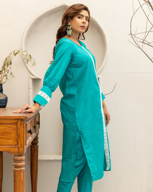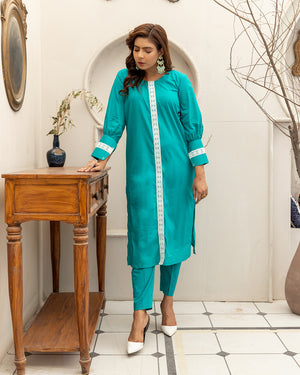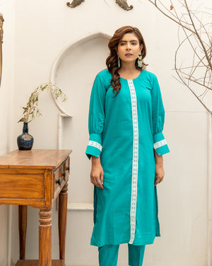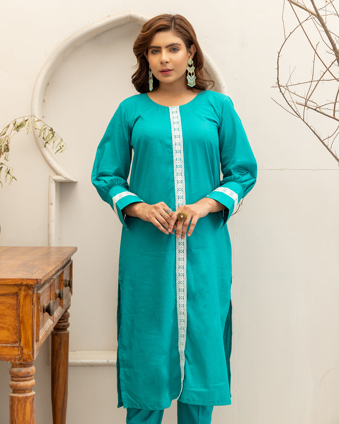 This beautiful 2PCS  outfit made in soft cotton fabric embellish with white lace on center & sleeves .   Length 45 .stitched styleish & westren cutline. Model is wearing size S.