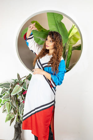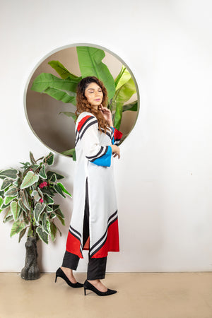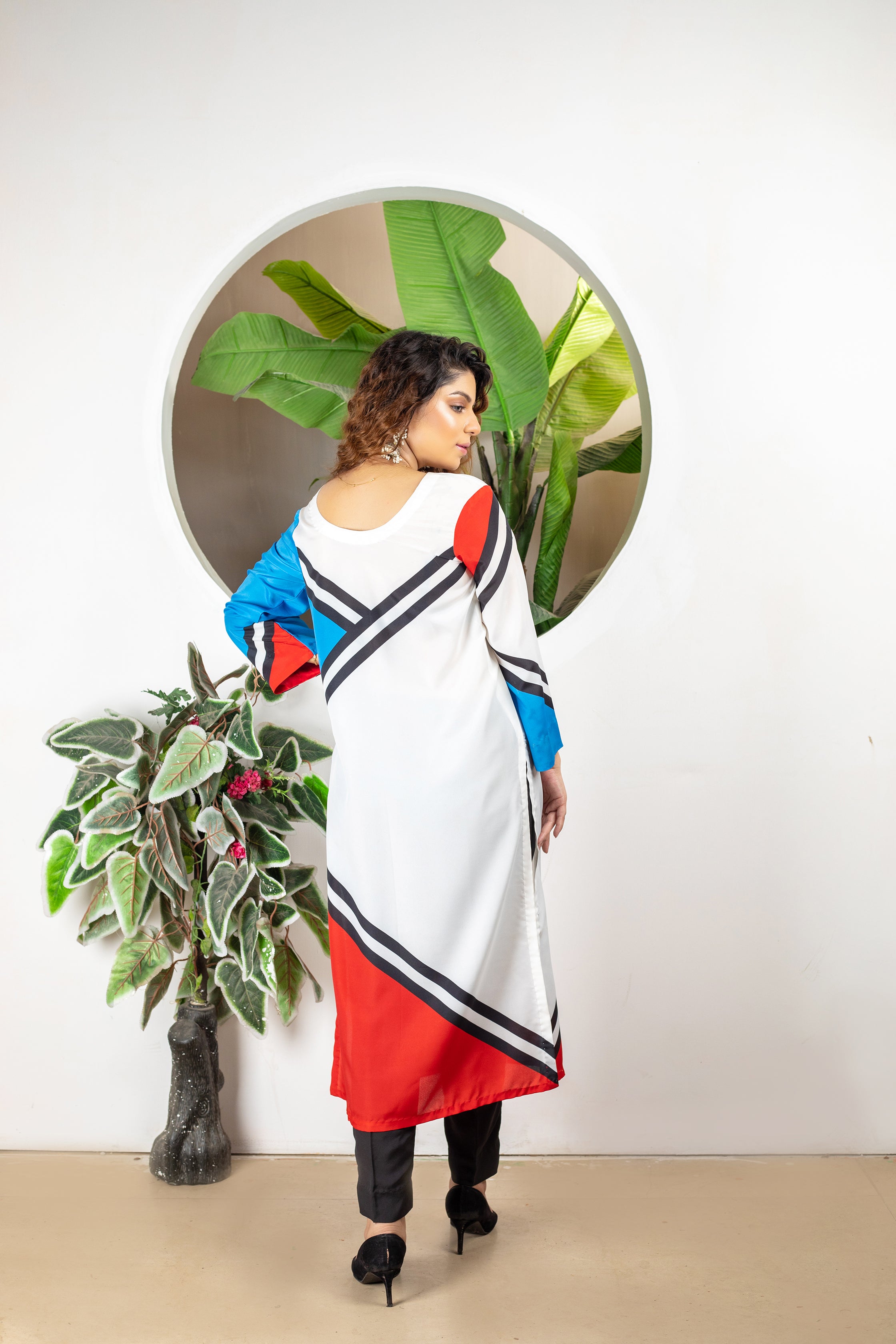 This off white slim fit top made in abstract color block print in our new and improved soft grip fabric with sweat absorbing properties, features a round neck, square armholes, full sleeves and side slits. Length 48", Model is wearing small size.