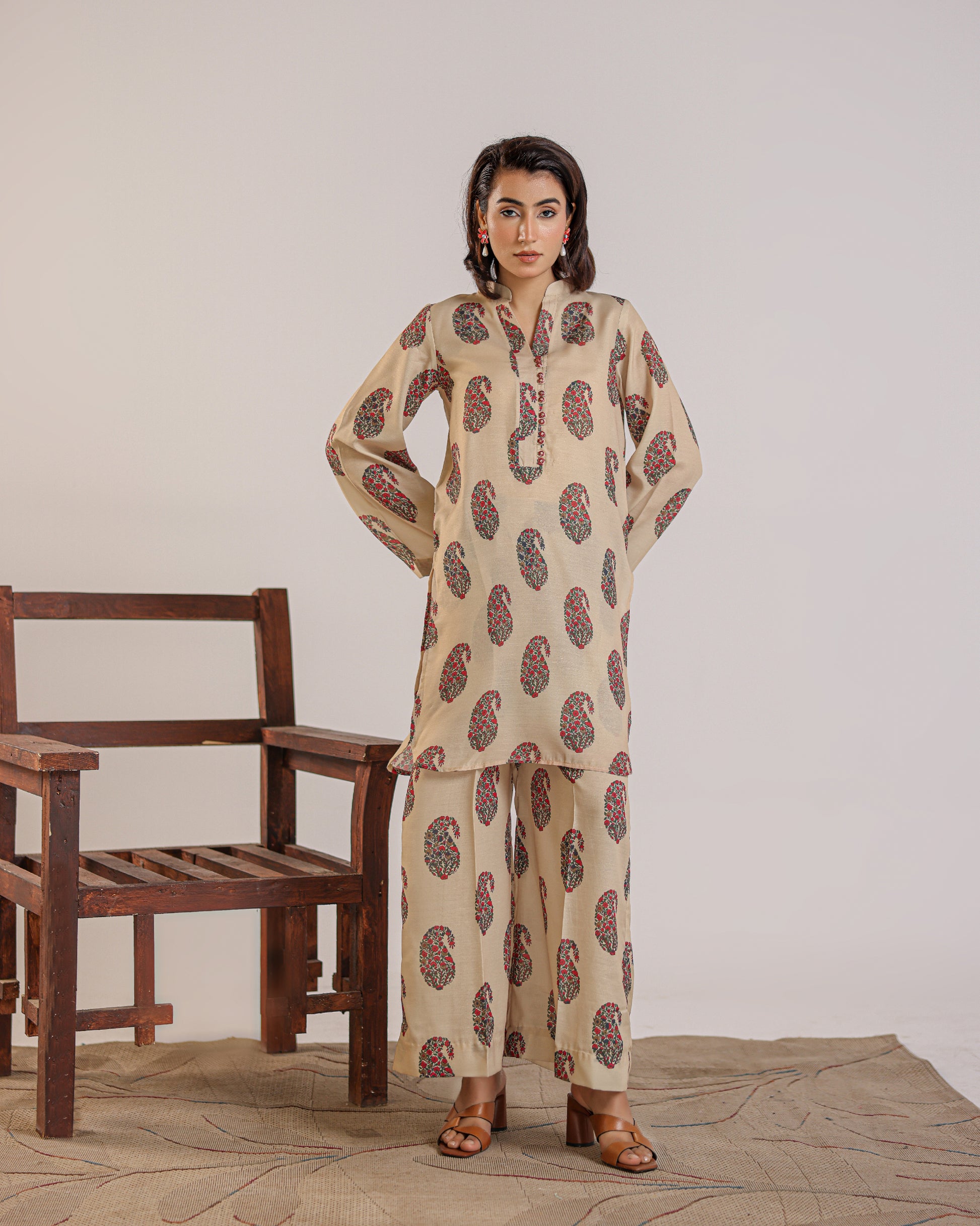 The Areeza Set brings together tradition and timeless sophistication. Designed in a classic paisley-inspired print on a soft neutral base, this two-piece set reflects a balance of heritage and modern ease. The straight kurta with a neat V-neckline and front button detailing exudes understated elegance, while the straight trousers complete the look with effortless grace.