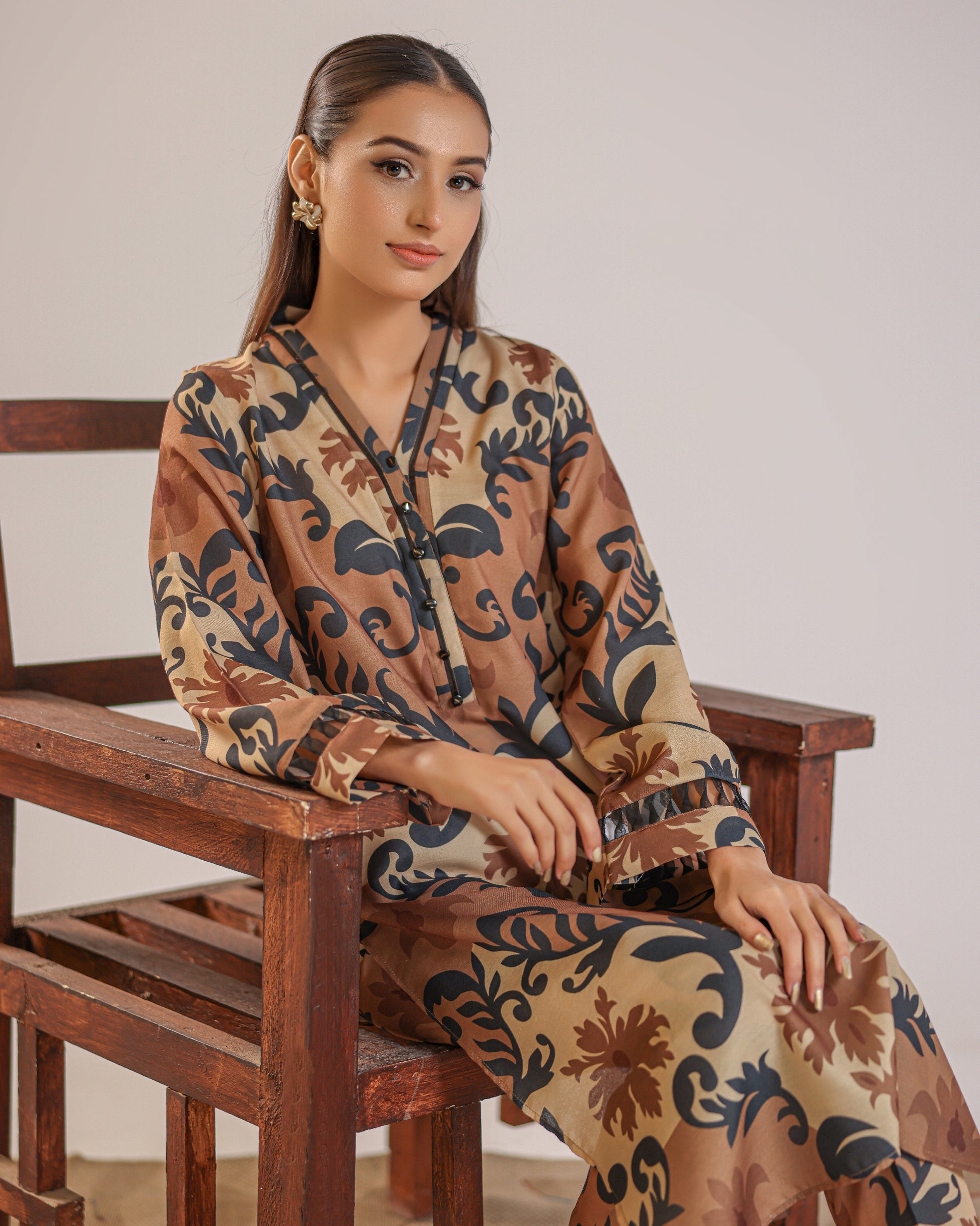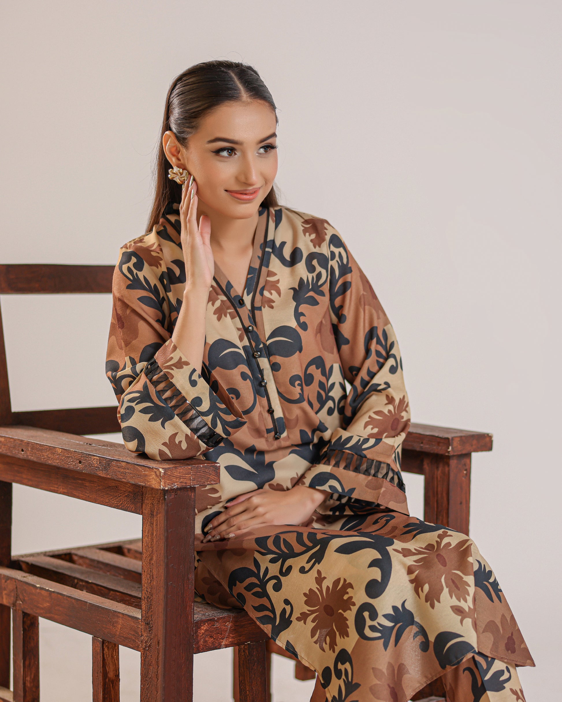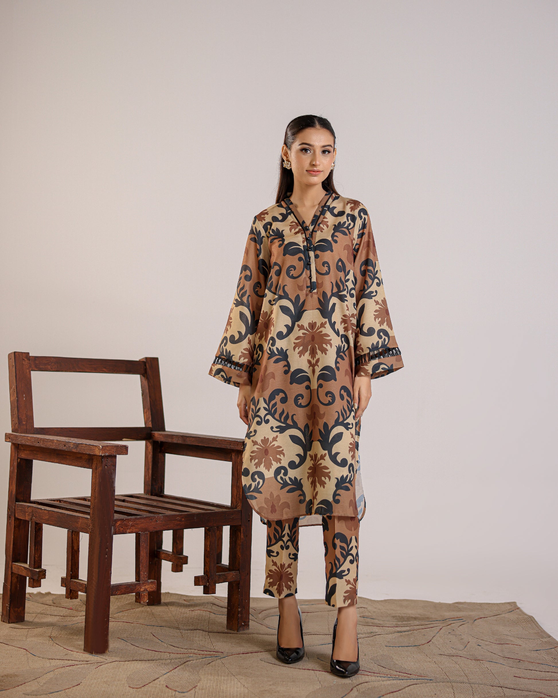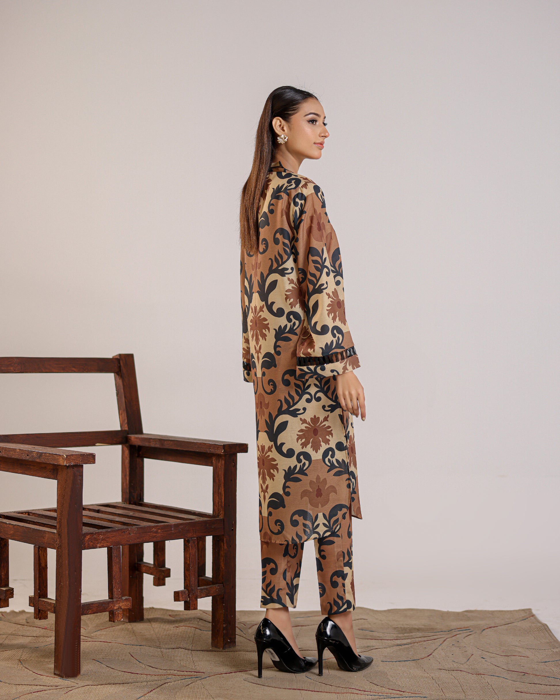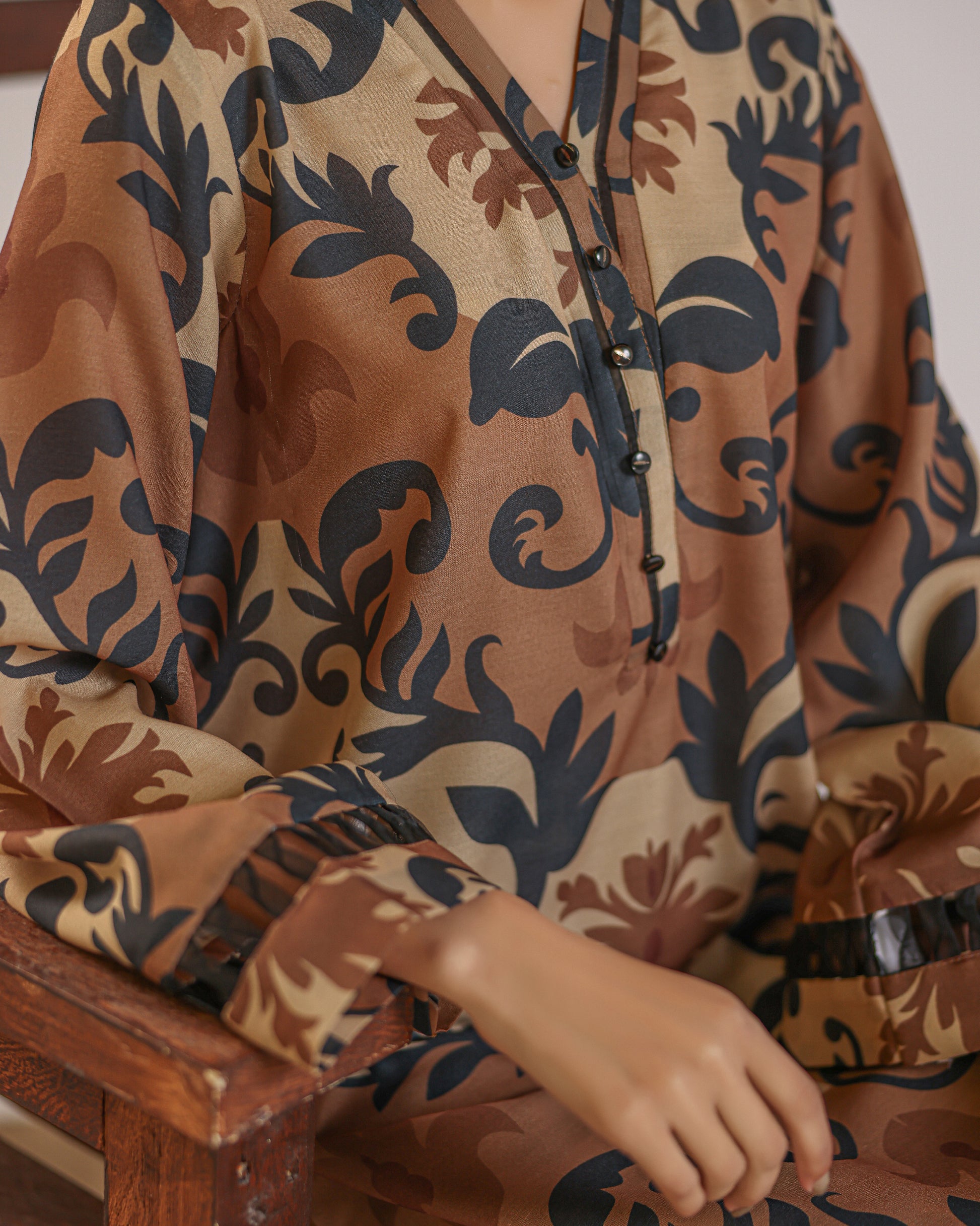 An elegant blend of tradition and modern artistry — the Noira Set brings timeless sophistication to your wardrobe. Designed in a rich earthy palette, this long shirt features a rounded hemline that adds graceful movement to the silhouette. The baroque-inspired print stands out beautifully against warm tones, while the detailed sleeve borders add a refined touch.
