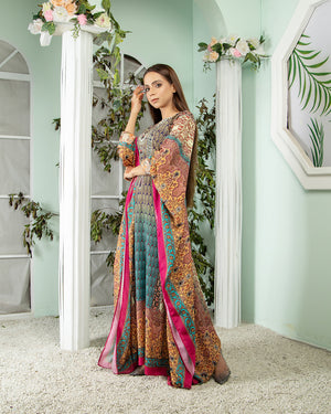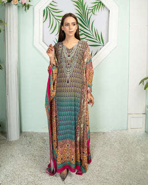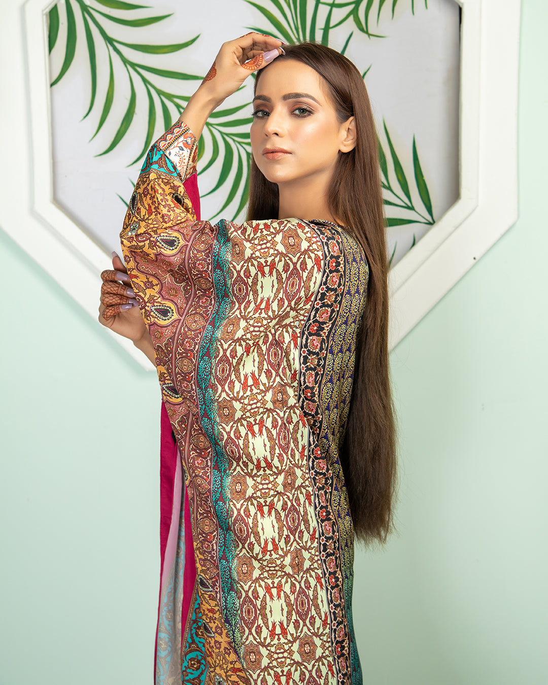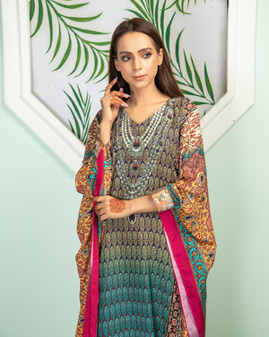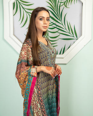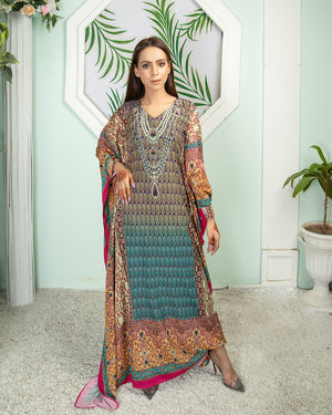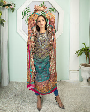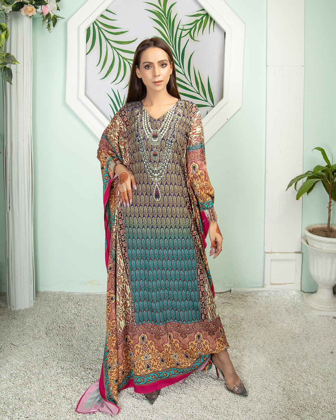 This beautiful printed KATAN outfit made in soft GRIP SILK fabric. Length 53 .stitched styleish & westren cutline. Model is wearing size S.