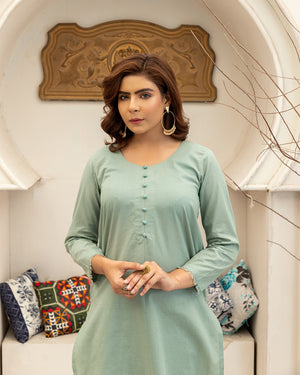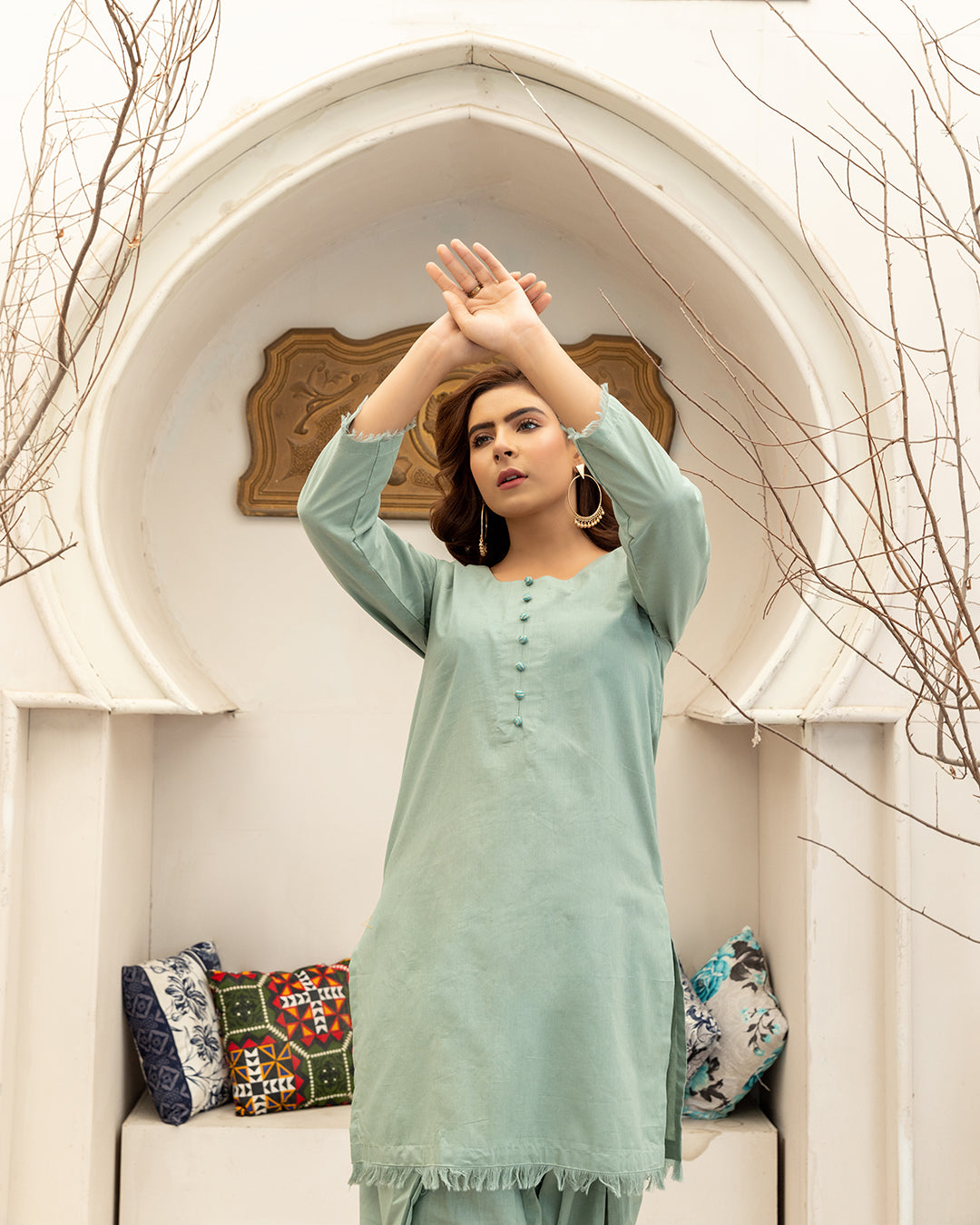 This outfit shirt & trouser made in soft cotton fabric embellish with  lace on DAMAN, & butoon on nick line. Length 36''. Model is wearing size S.