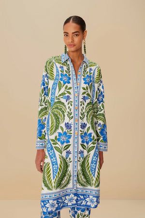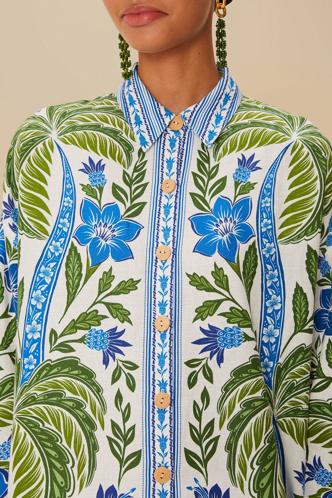 Fresh, vibrant, and effortlessly elegant — this two-piece co-ord set features a stunning blend of blue florals and lush green foliage on a crisp ivory base. The artistic botanical print, enriched with detailed borders, creates a refined yet refreshing look perfect for daytime events, resort wear, or elevated casual outings.