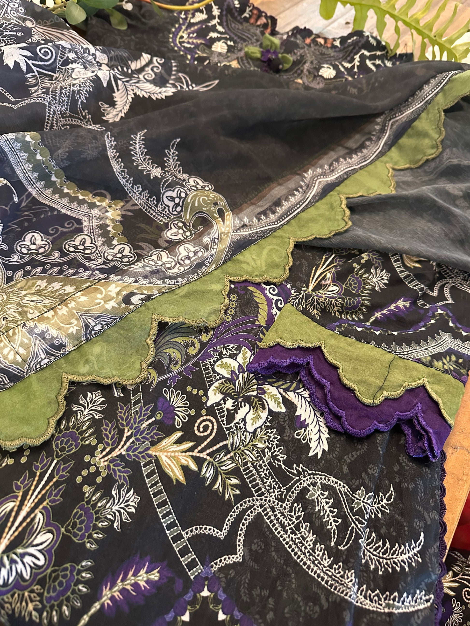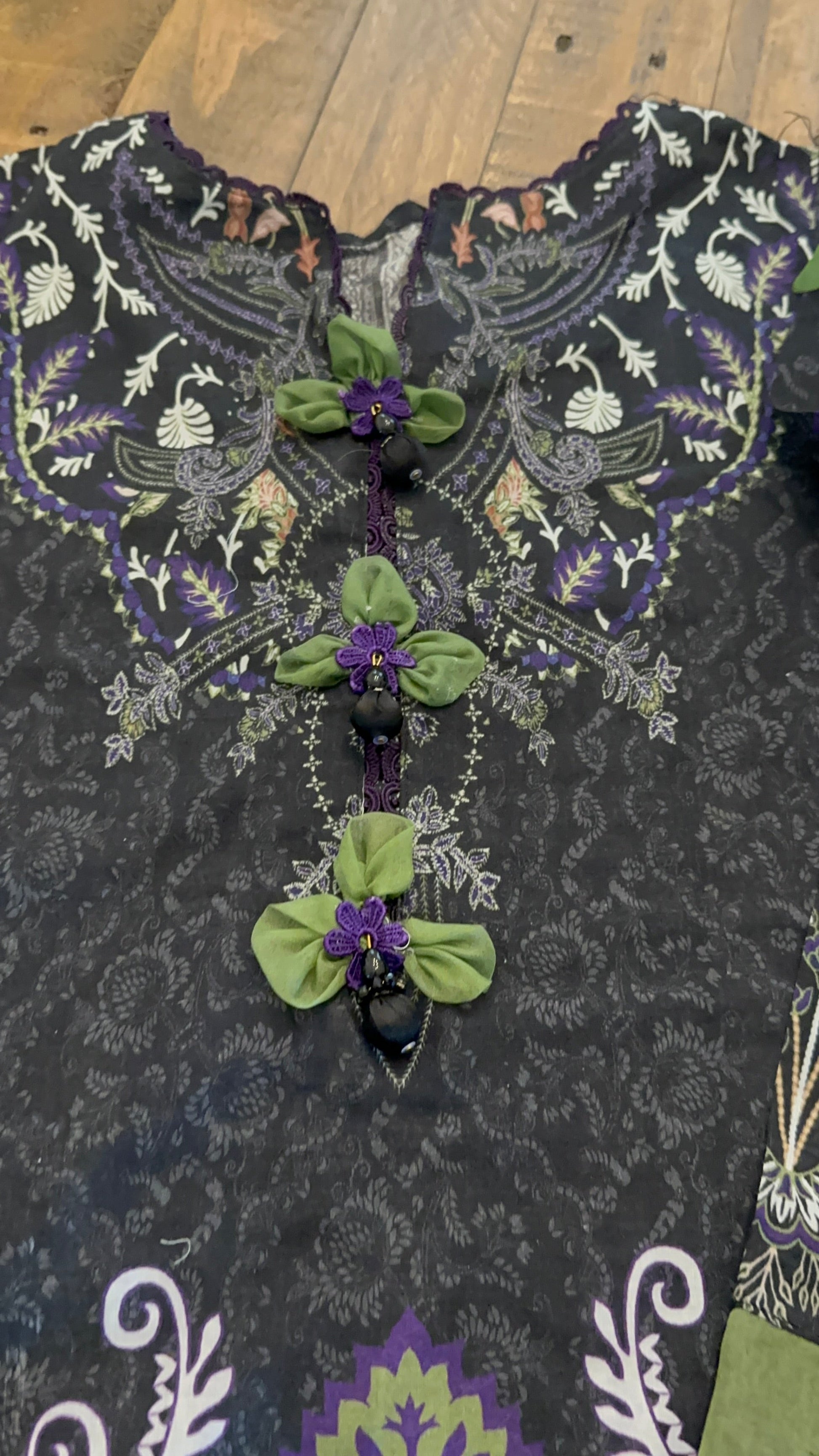 Elevate your summer wardrobe with Gul-e-Raatan, a premium soft lawn ensemble that blends bold elegance with a mystical charm. Featuring rich floral patterns inspired by tulip blossoms, this deep black lawn is accented with regal shades of purple and green, evoking the aura of a rare flower blooming under a starlit sky.