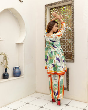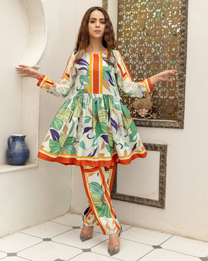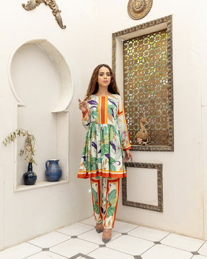 This beautiful printed outfit short frock & trouser made in breeza lawn fabric Length 31.stitched styleish & westren cutline. Model is wearing size S.