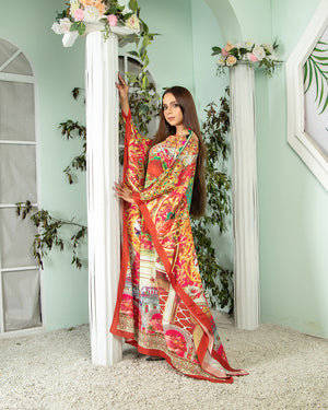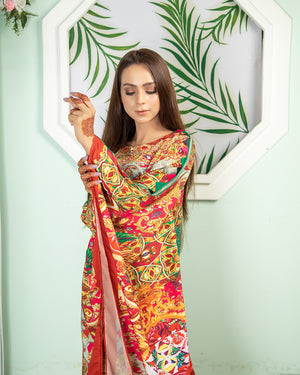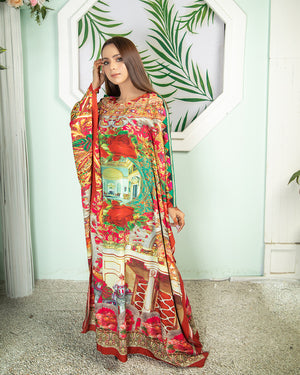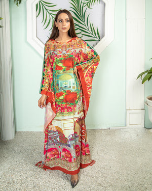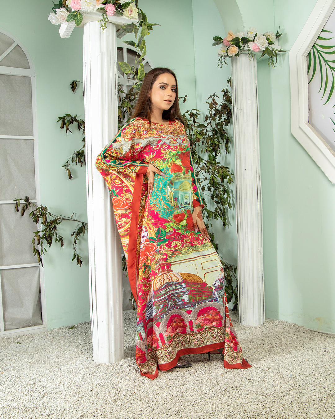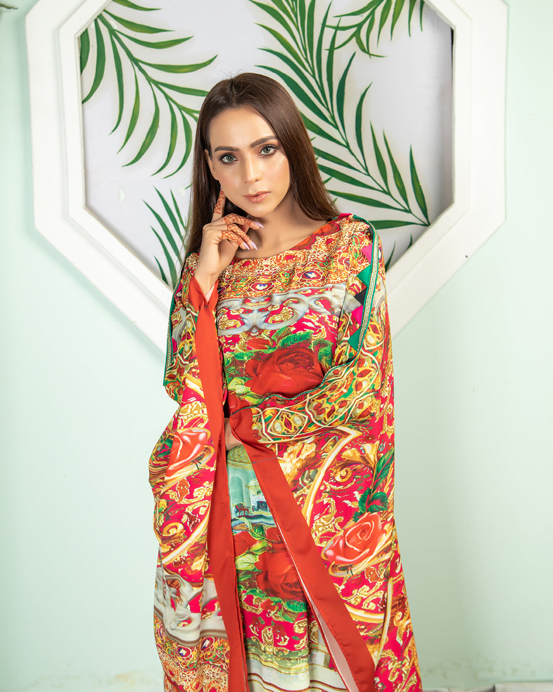 This beautiful printed KATAN outfit made in soft GRIP SILK fabric. Length 53 .stitched styleish & westren cutline. Model is wearing size S.