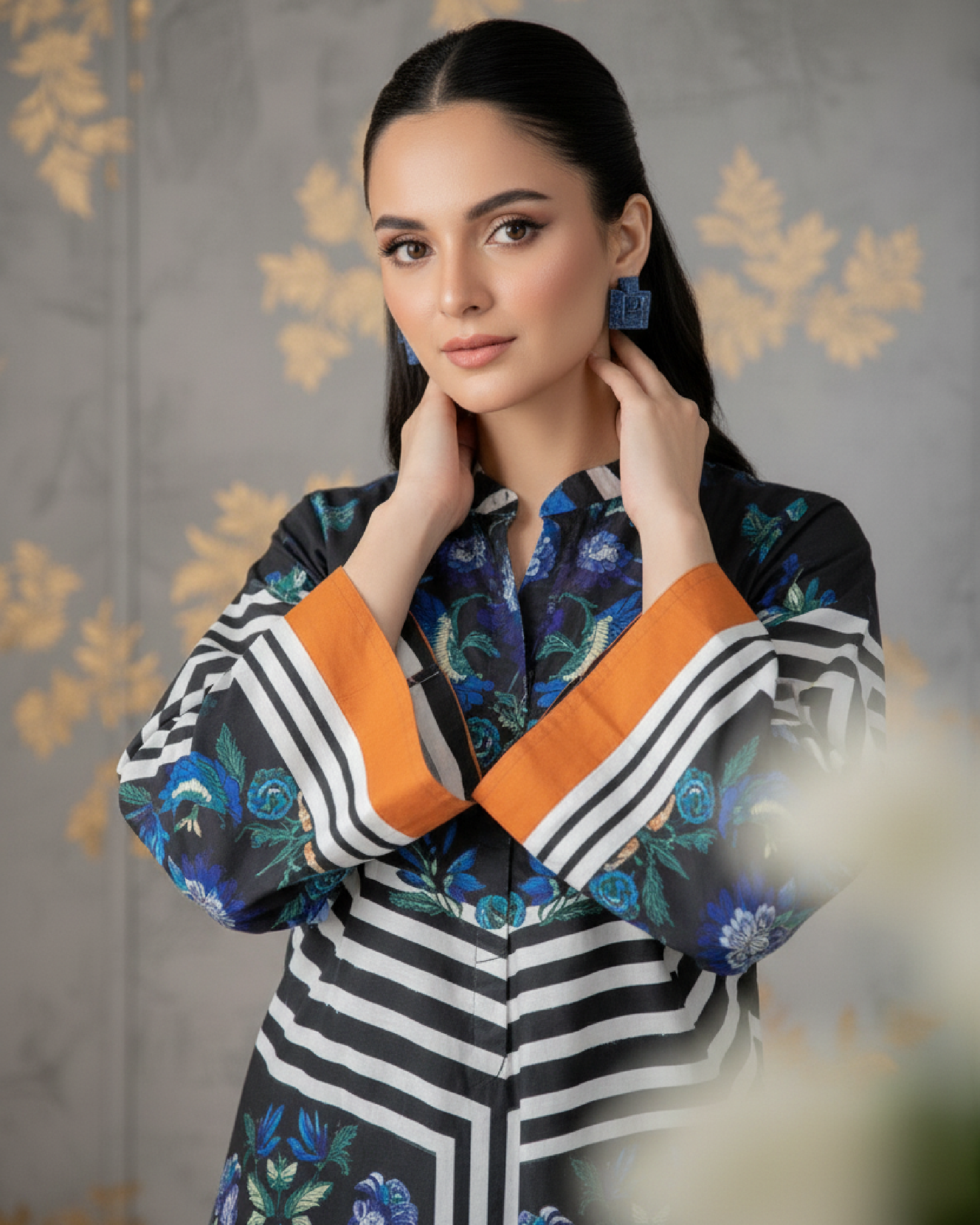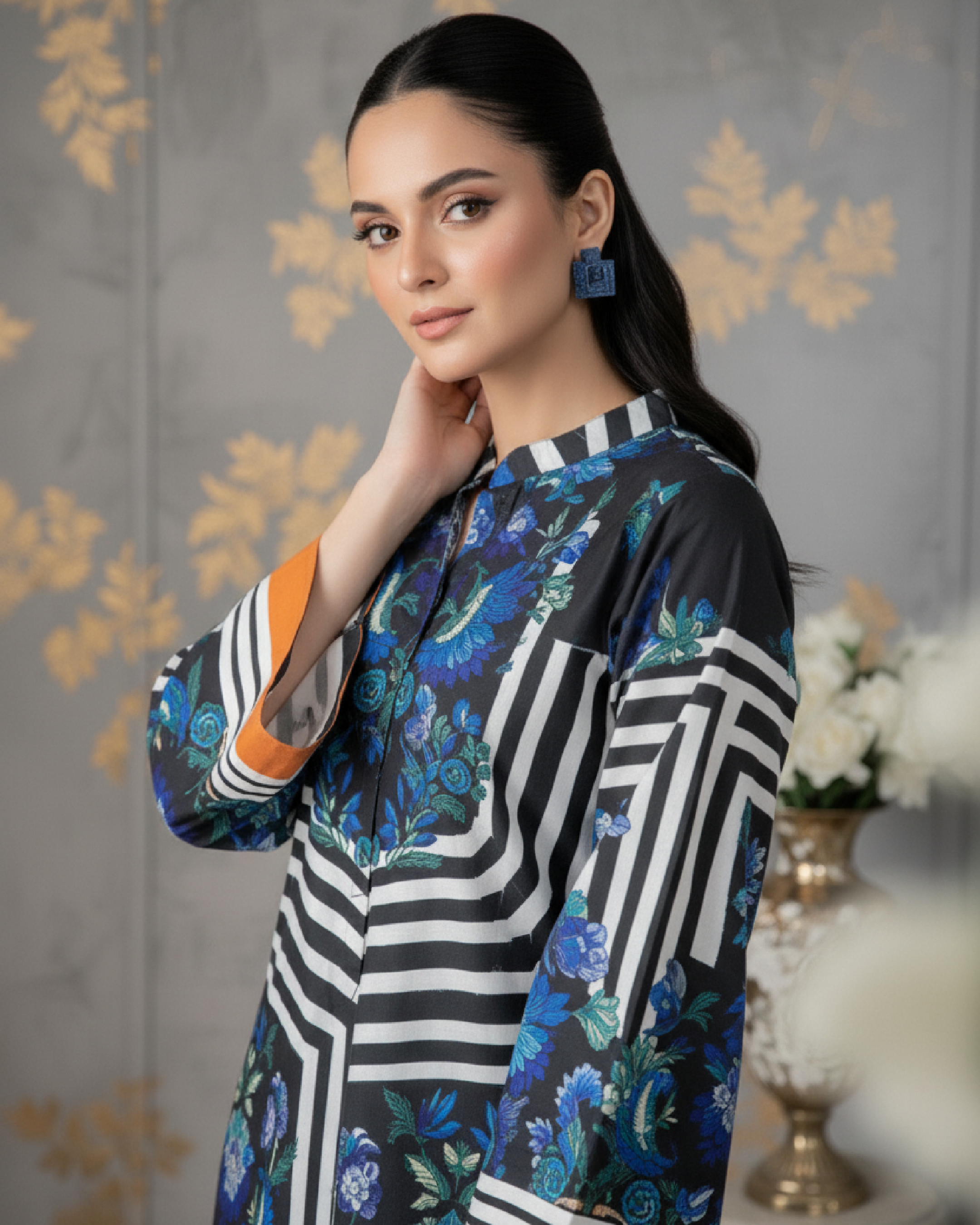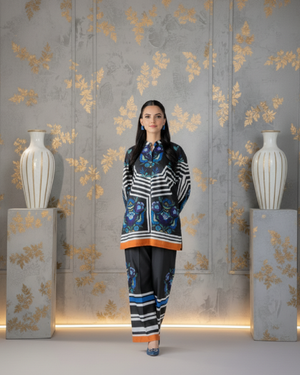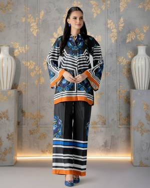 Bold, striking, and effortlessly modern — this two-piece outfit features a short printed shirt in a captivating mix of black, white, and electric blue tones. The geometric stripe design is enhanced with vibrant floral accents, while orange borders add a chic pop of contrast for a refined yet daring statement.