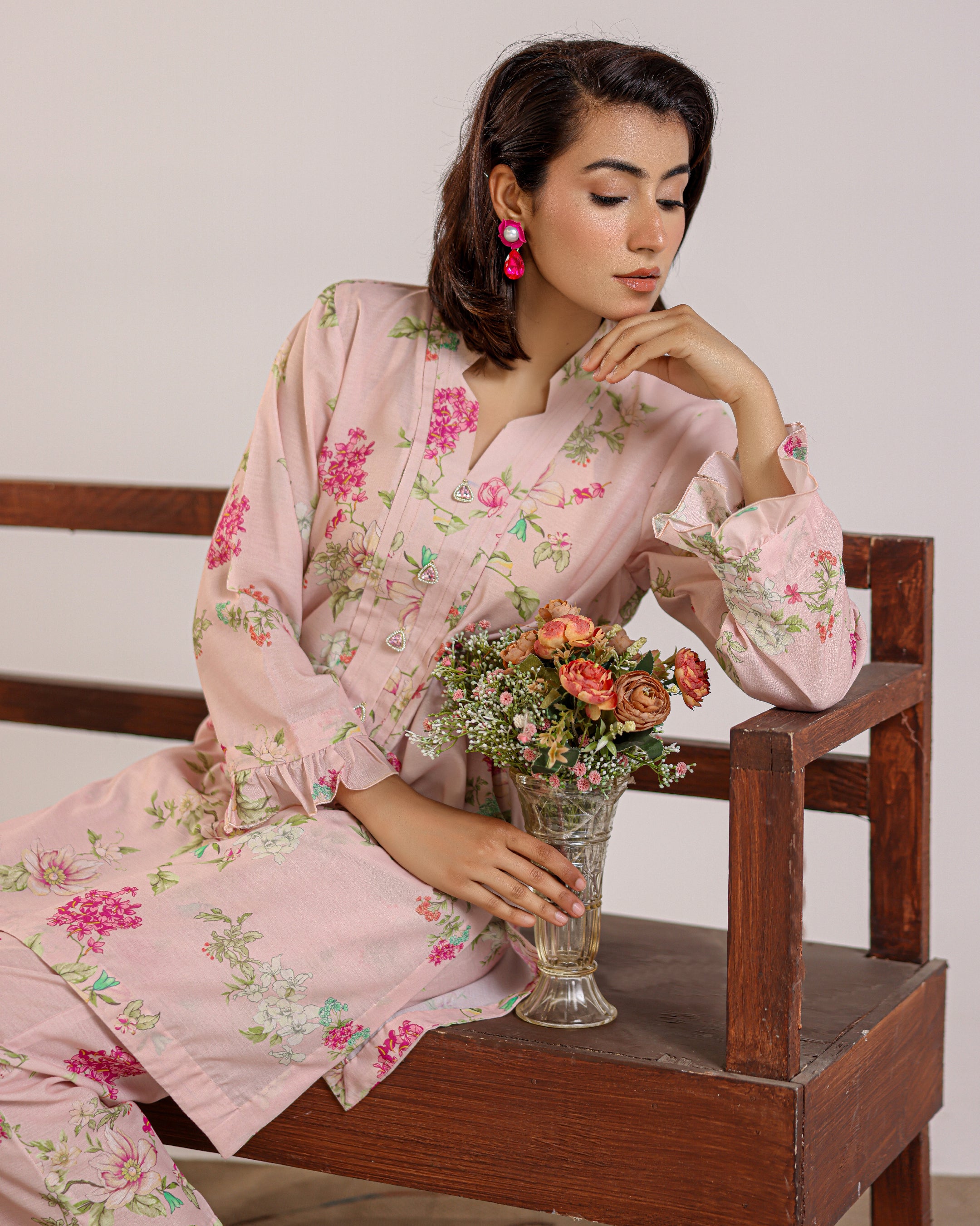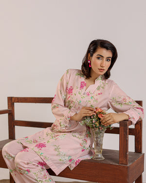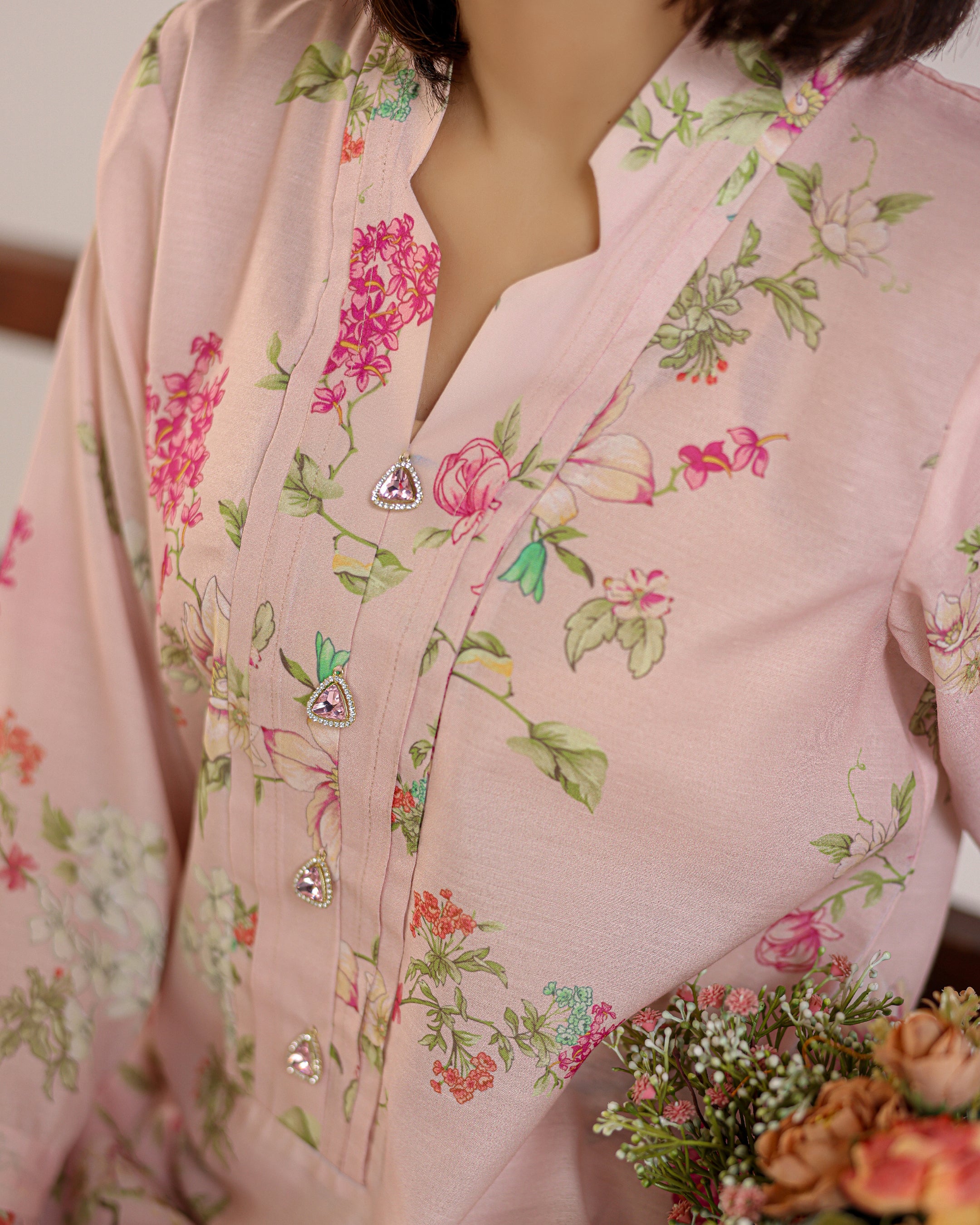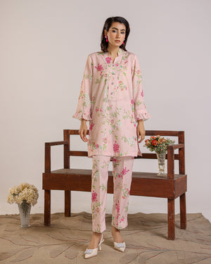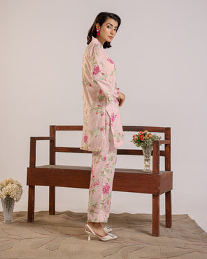 The Tessara Bloom Two-Piece embodies timeless femininity and effortless elegance. Crafted with a delicate floral print, this outfit features a short kurta adorned with front panel detailing and intricate tassel embellishments that add a graceful handcrafted touch. The flared sleeves bring subtle drama and flow, while the straight trousers ensure a sleek and comfortable silhouette.