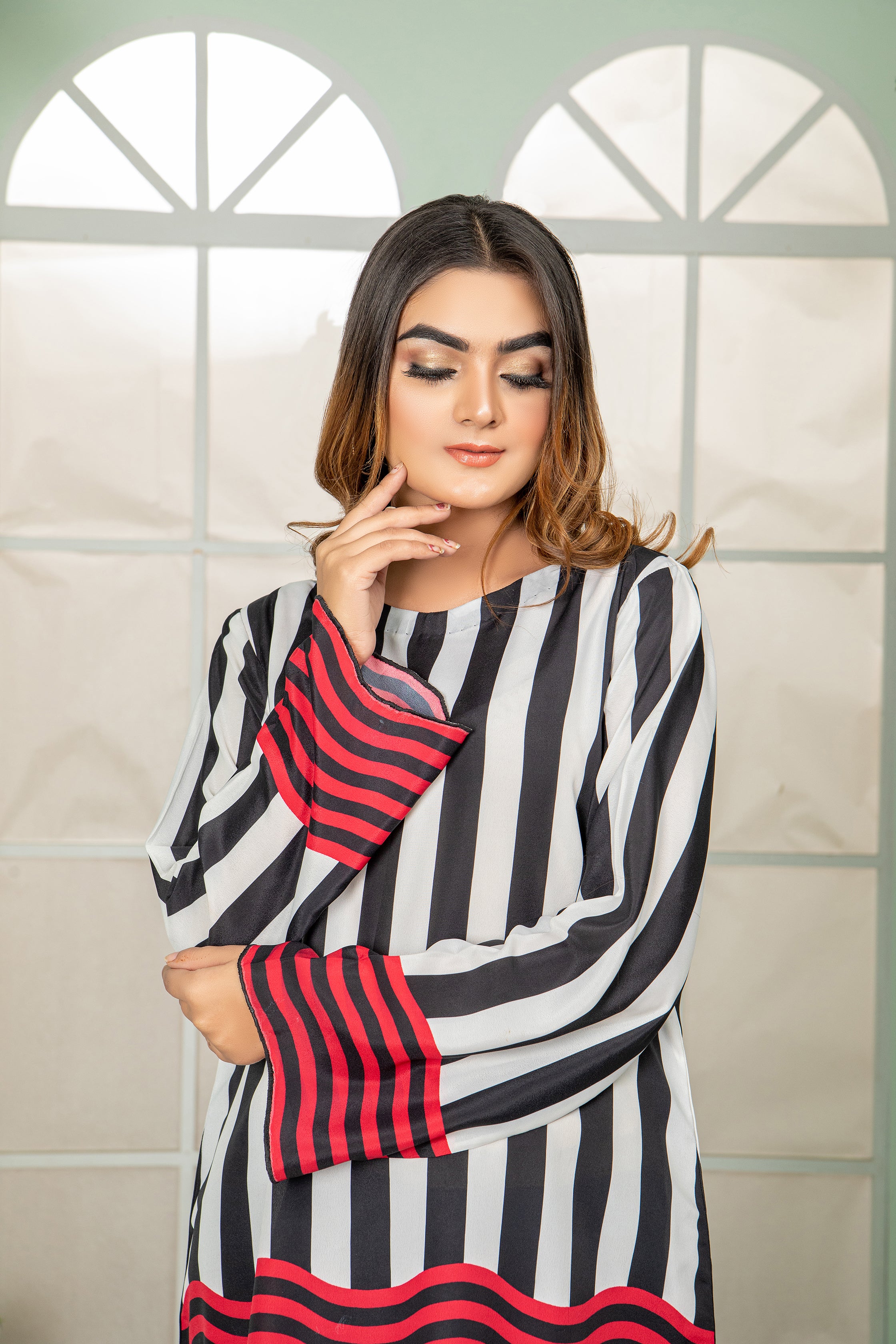 This shirt  made in beautiful print in our new and improved soft GRIP  fabric with sweat absorbing properties.  front Length  is 27 & back lenght is 32.   Model is wearing small size.